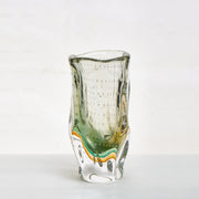 This artistic glass vase blends amber, emerald, and clear tones into a smooth, rainbow-like gradient flow. The rim curves in a soft, organic wave, giving the piece a collected, gallery-like presence. Perfect for console tables, entryways, or as a standalone art object — a refined choice for homes that value unique, modern, light-luxury design.