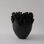 A handmade ceramic urn vase defined by its dramatic crown-like rim — dozens of sculpted tubular forms rising upward. The base remains smooth and understated, letting the expressive texture at the top take center stage. A striking piece meant for homes that value art, form, and individuality.